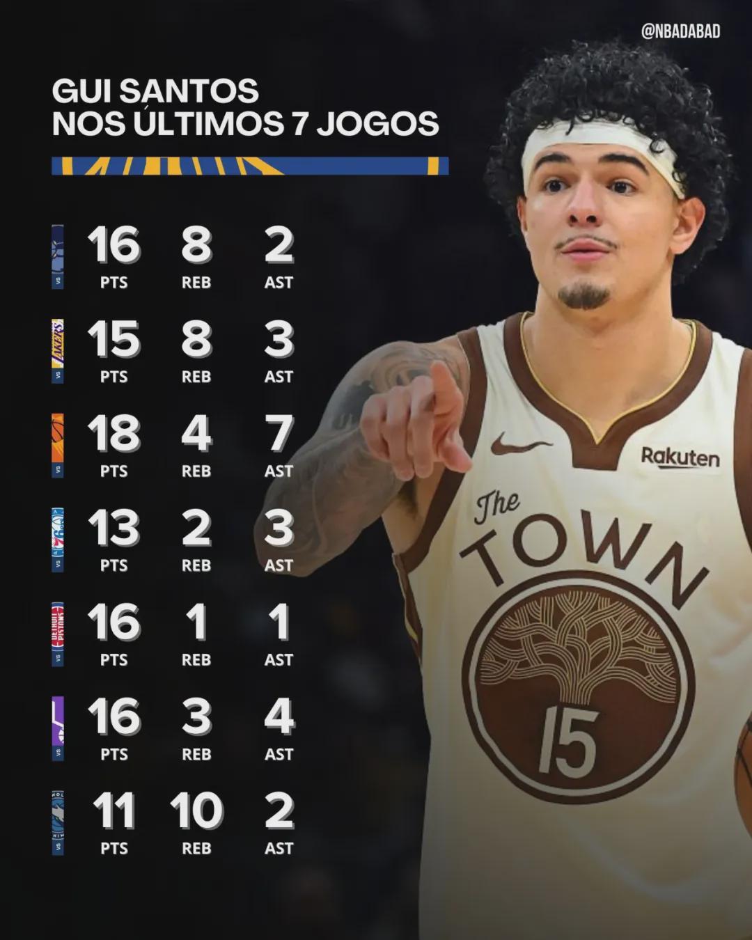 2022年NBA选秀大会,桑托斯在第55顺位被勇士选中,他的起点并不算高。新秀赛季=他一直在发展联盟效力,场均12.7分6板2.2助,直到2023年11月8日,勇士才将其正式签下。2023-24赛季场均出战8.3分钟,仅得2.1分0.6板。