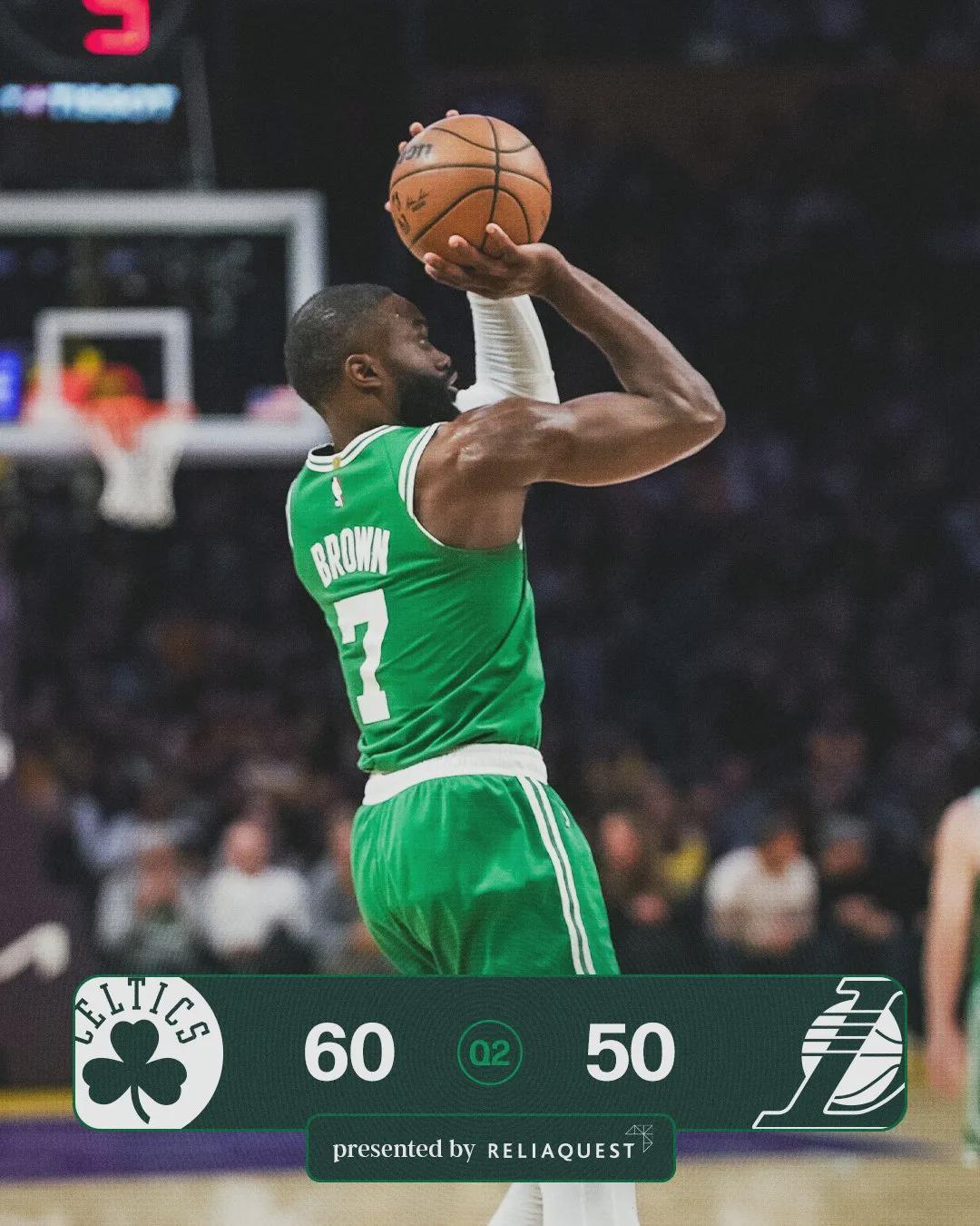 凯尔特人替补半场合砍20分,湖人替补半场合砍13分。杰伦-布朗上半场投篮12中3,但他频频造杀伤(罚球10中7),防守端十分积极,半场得到13分4篮板6助攻3抢断。凯尔特人第二节32-22净胜湖人10分,半场60-50领先湖人。