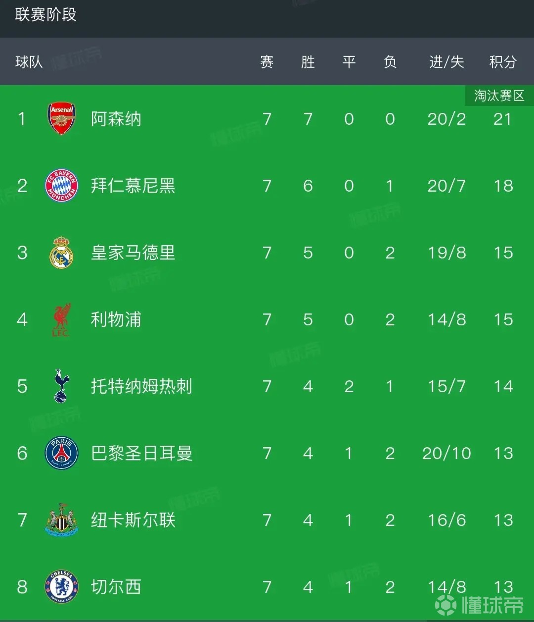 第七轮结束时,已经确定提前出线的阿森纳和拜仁排名前二,皇马和利物浦同积15分排名第三、第四,托特纳姆热刺14分第五,而巴黎、纽卡和切尔西同积13分排名六至八名。