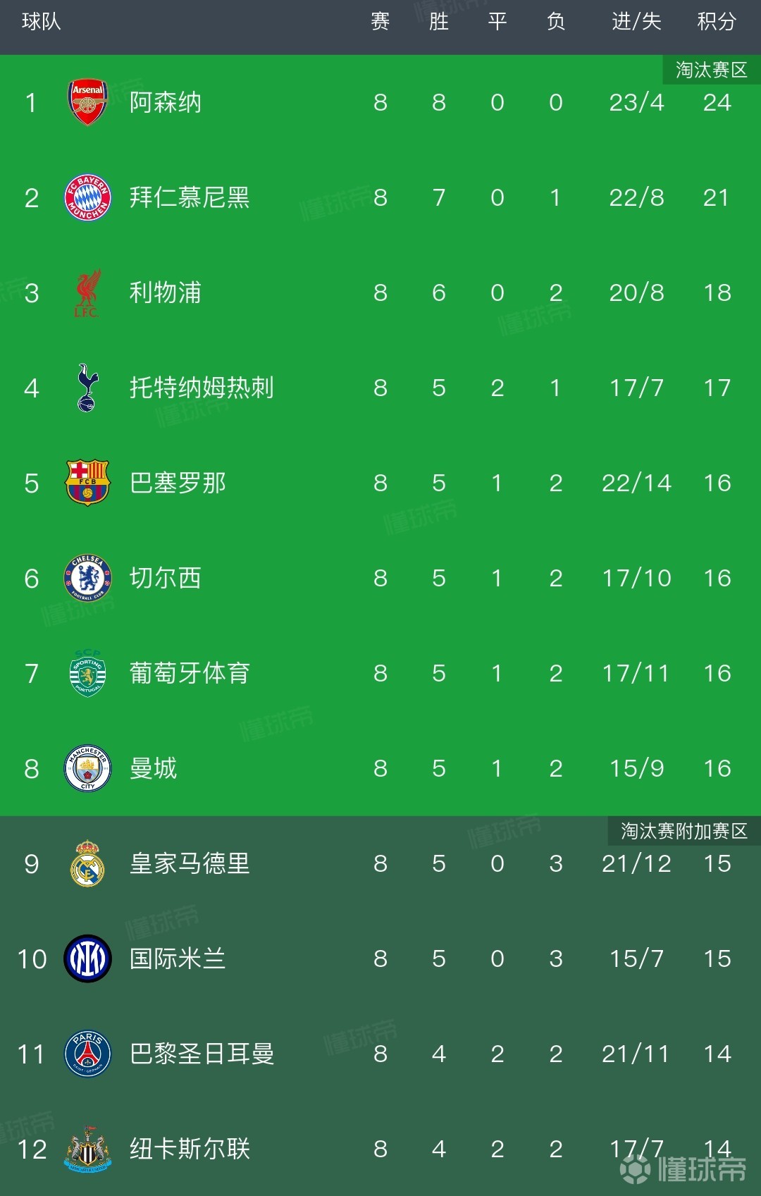 而在最后一轮所有比赛全部结束后,阿森纳和拜仁仍然排名前二,但后面的名次发生了非常大的变化,利物浦和热刺均上升一位,排名第三、第四,巴萨从第九升至第五,切尔西升至第六,葡萄牙体育从第十升至第七,而曼城从第十一升至第八;原本在第七轮排名第三的皇马最后一轮2-4不敌本菲卡,掉至第九,巴黎和纽卡本轮战平,也纷纷掉出前八,这三支球队将会征战附加赛。