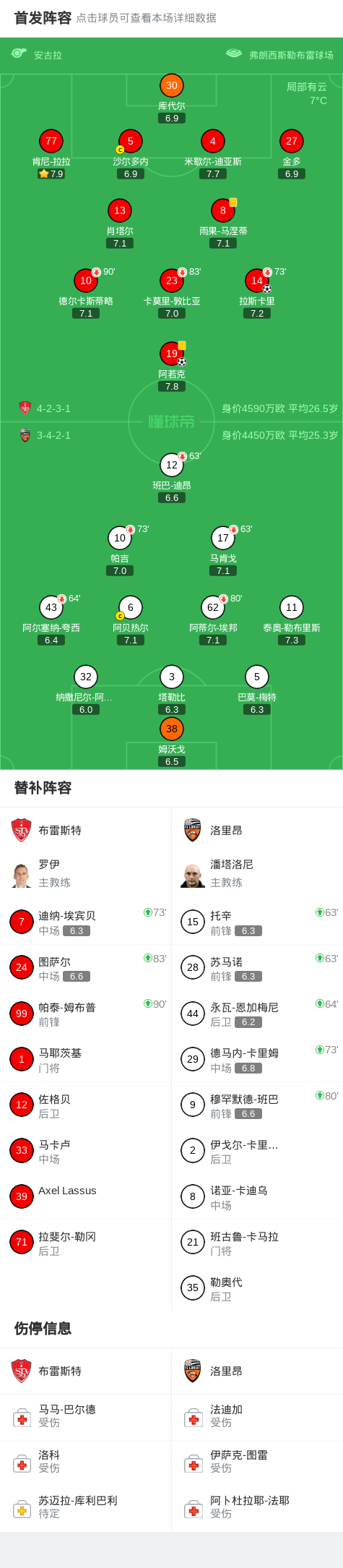 第50分钟,布雷斯特球员拉斯卡里打入一球。