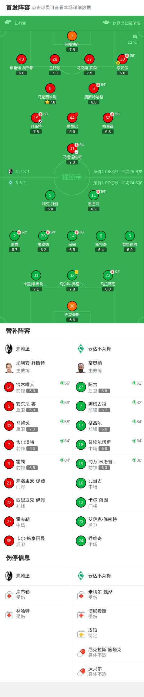 第52分钟,弗赖堡球队曼赞比吃到红牌。