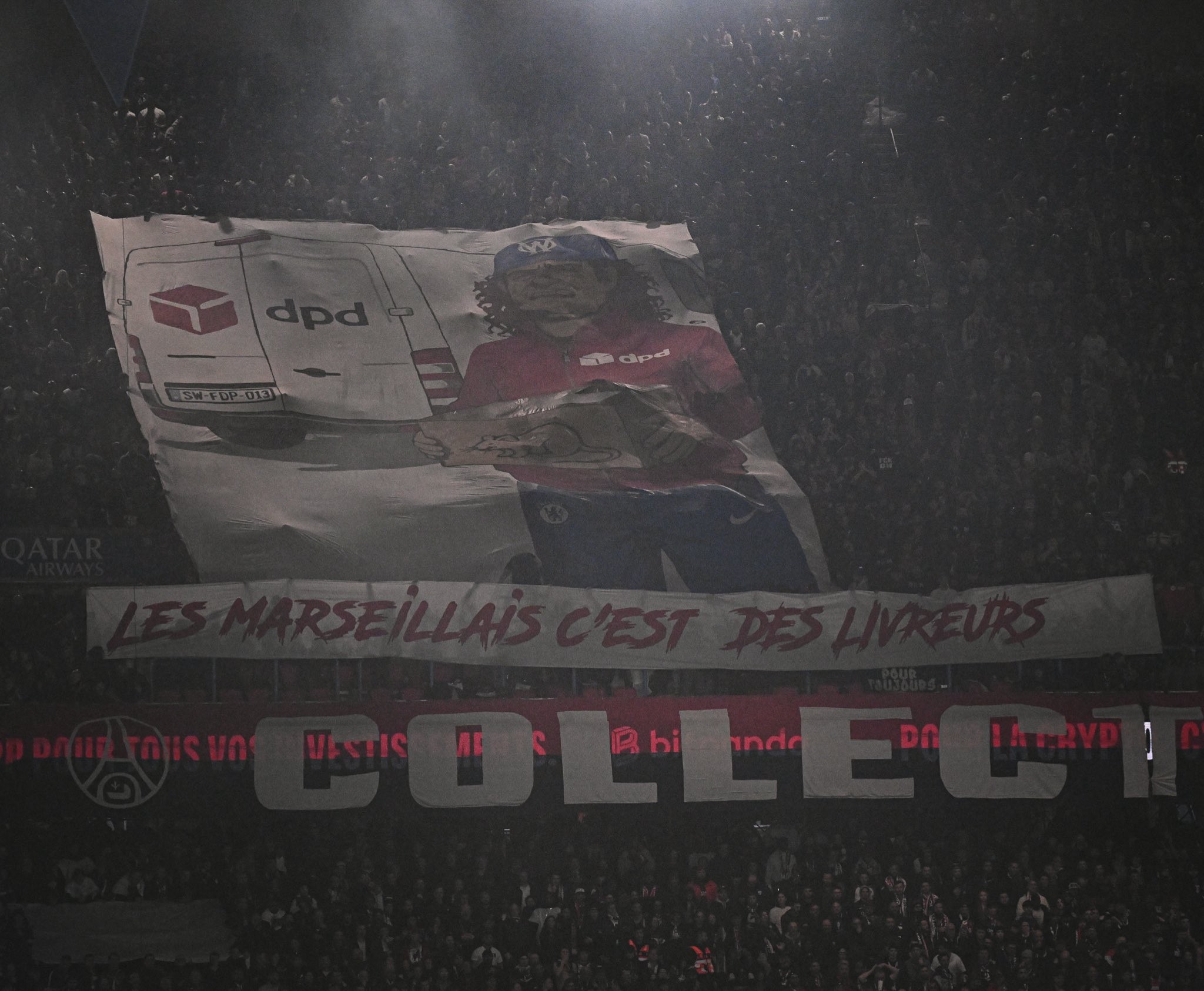 其中,在奥特尔看台左上方展示的一条横幅尤为刺眼。画面中,一名身穿DPD快递公司制服、头戴马赛队帽、身穿切尔西运动裤的快递员,手里拿着一个画有老鼠的纸箱。这条Tifo横幅配文写道:“马赛人,都是快递员。”