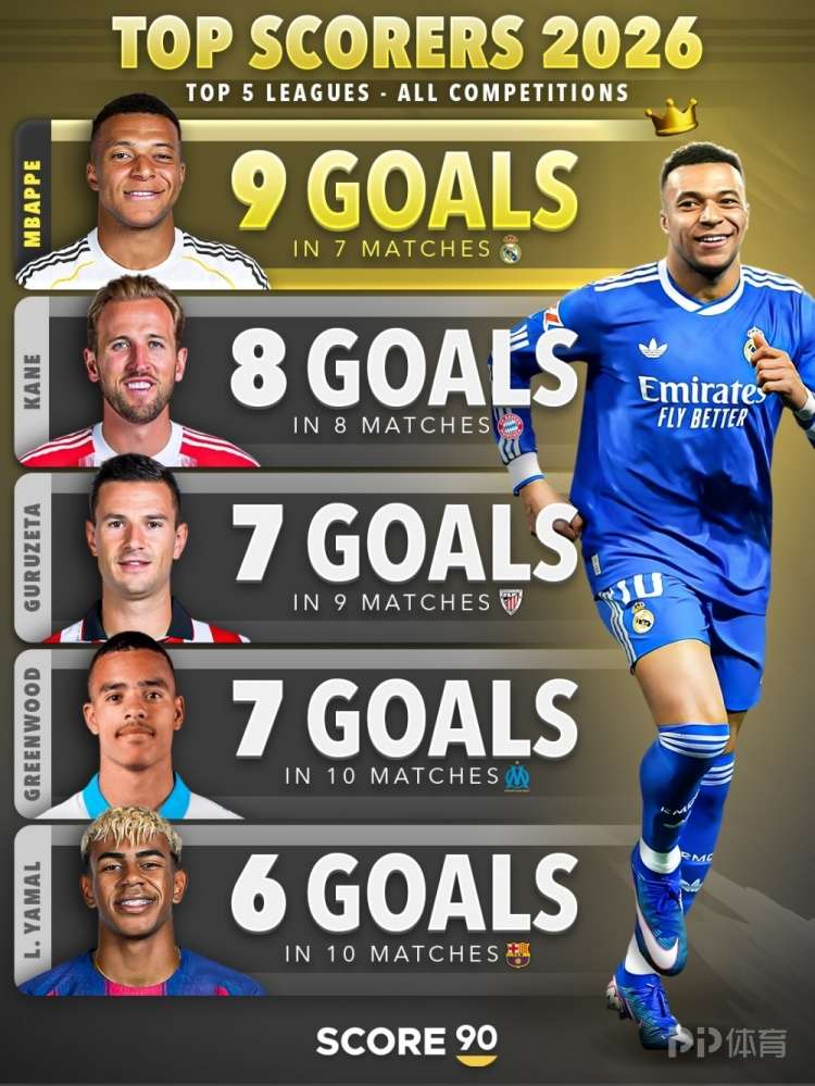 Score90统计了五大联赛球员2026年各赛事的进球数量,并列出2026年进球榜,姆巴佩7场9球居首。
