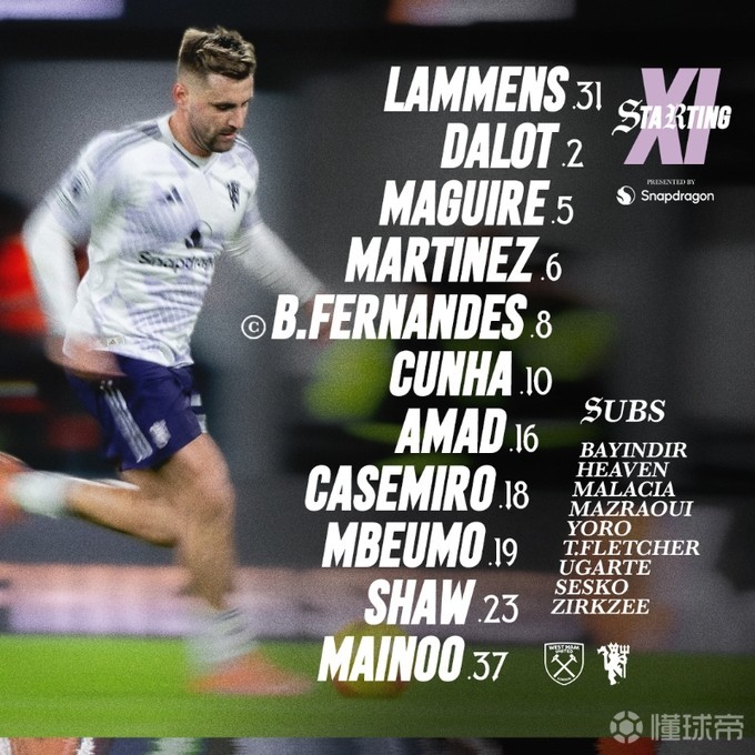 曼联首发:31-拉门斯、23-卢克-肖、6-马丁内斯、5-马奎尔、2-达洛特、37-梅努、18-卡塞米罗、19-姆伯莫、8-布鲁诺-费尔南德斯、16-迪亚洛、10-库尼亚