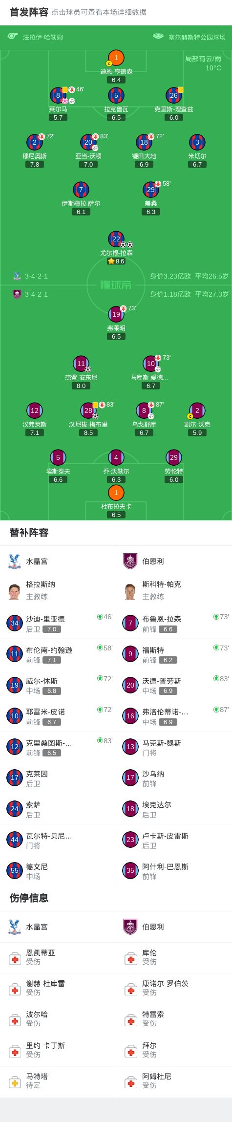北京时间2月12日英格兰足球顶级联赛 联赛 第26轮,水晶宫主场对阵伯恩利。水晶宫尤尔根-拉森梅开二度,莱尔马自摆乌龙。伯恩利汉尼拔-梅布里破门,杰登-安东尼破门。最终比分水晶宫 2-3 伯恩利。