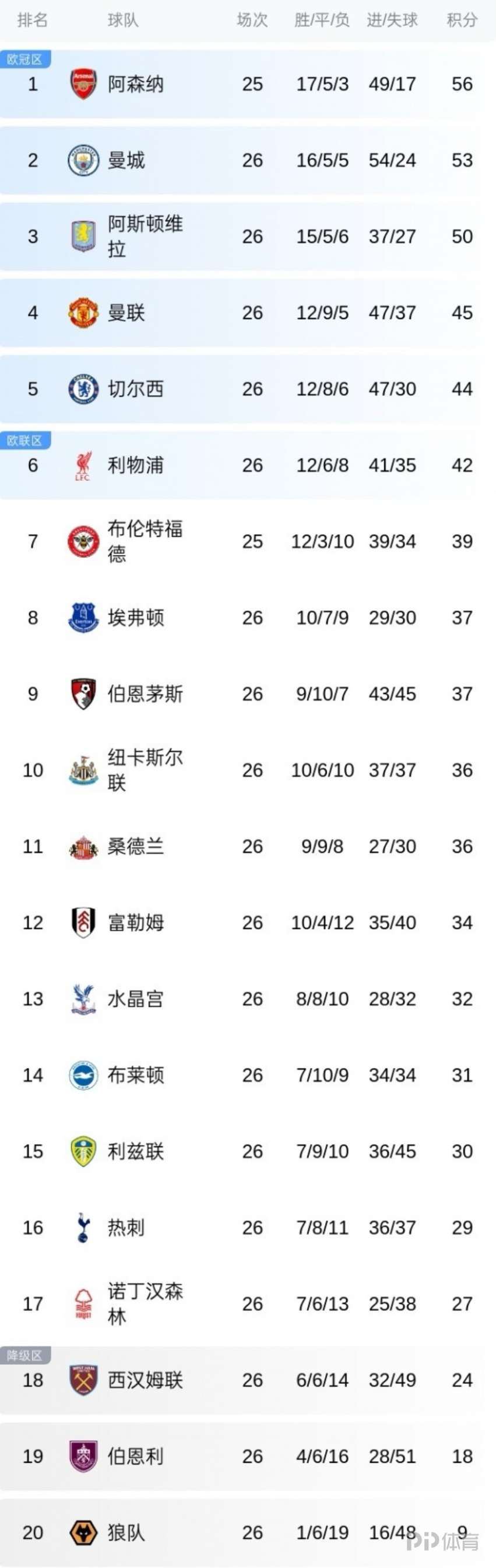 英超积分榜:曼城先赛落后榜首3分 枪手将战布伦特福德