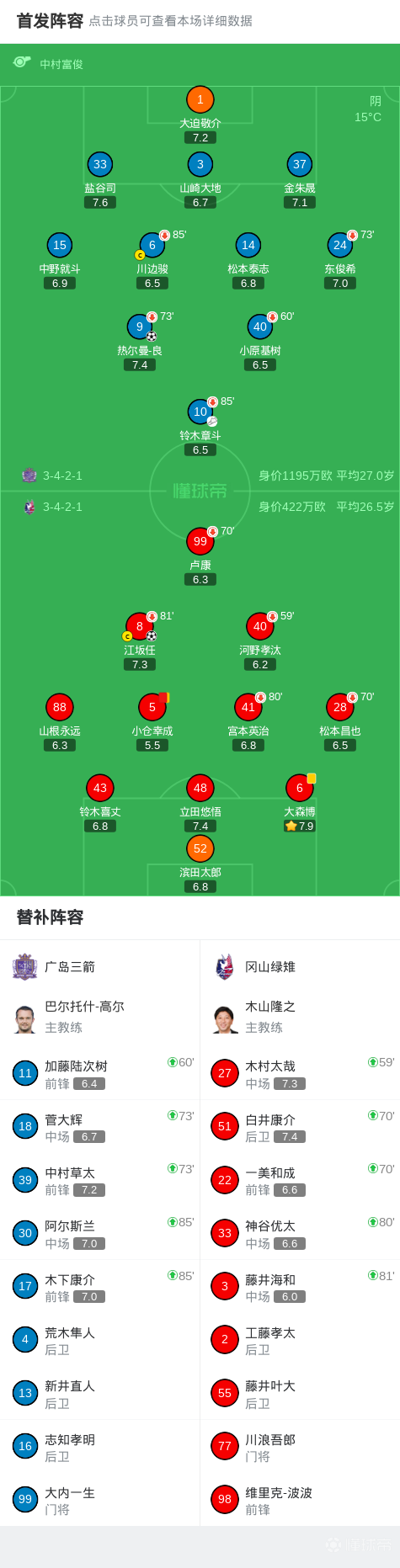 北京时间2月14日日本职业联赛J1西区第2轮,广岛三箭主场对阵冈山绿雉。广岛三箭热尔曼-良破门。冈山绿雉江坂任破门,小仓幸成染红。最终比分广岛三箭点球大战总比分6-5击败冈山绿雉。
