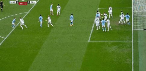第36分钟,曼城角球开出,斯通斯前插抢点倒地