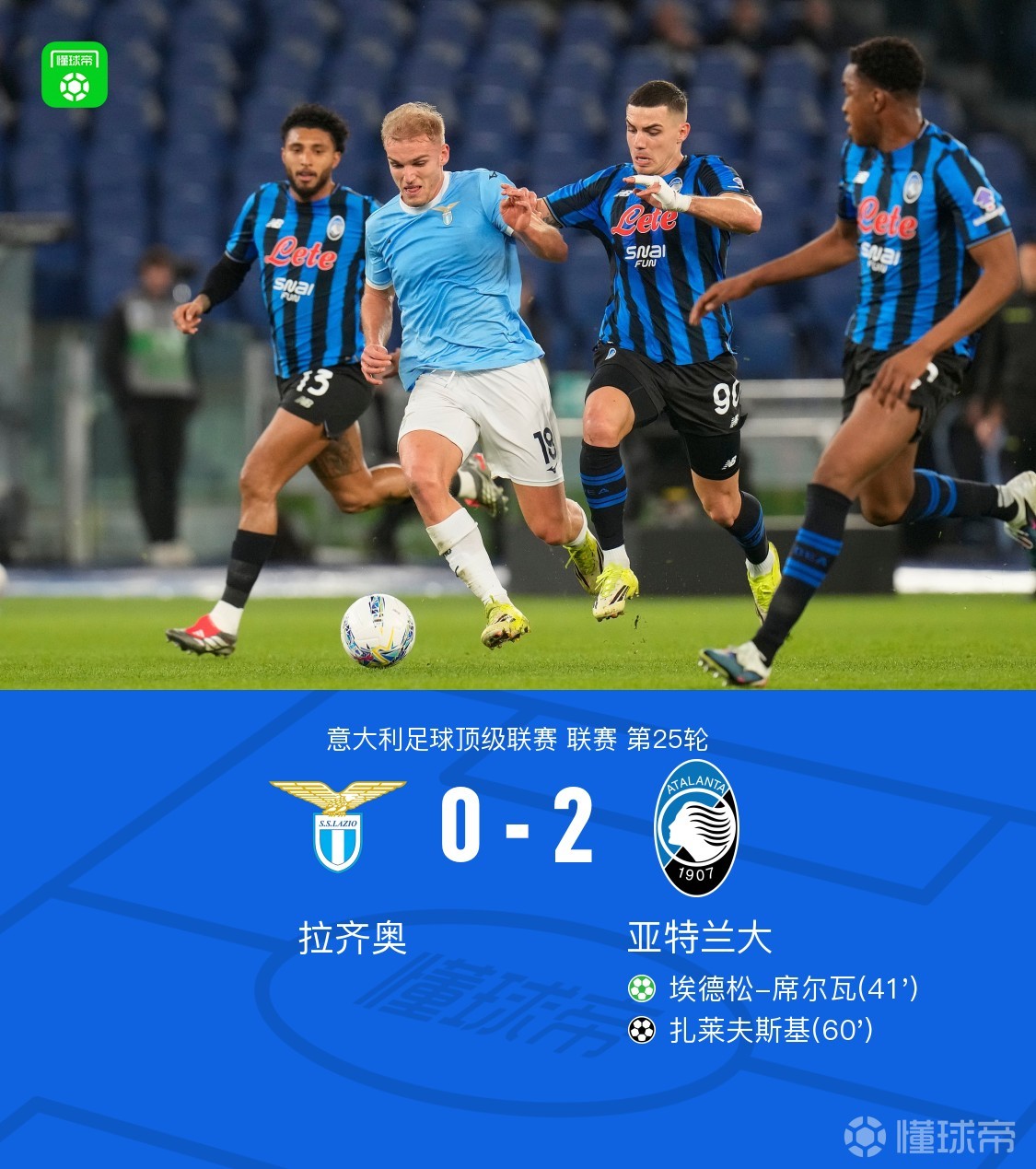 北京时间2月15日意大利足球顶级联赛第25轮,拉齐奥主场对阵亚特兰大。比赛中,上半场埃德松-席尔瓦点射破门首开纪录,随后贝尔纳斯科尼助攻,扎莱夫斯基打进世界波。最终比分拉齐奥0-2亚特兰大。