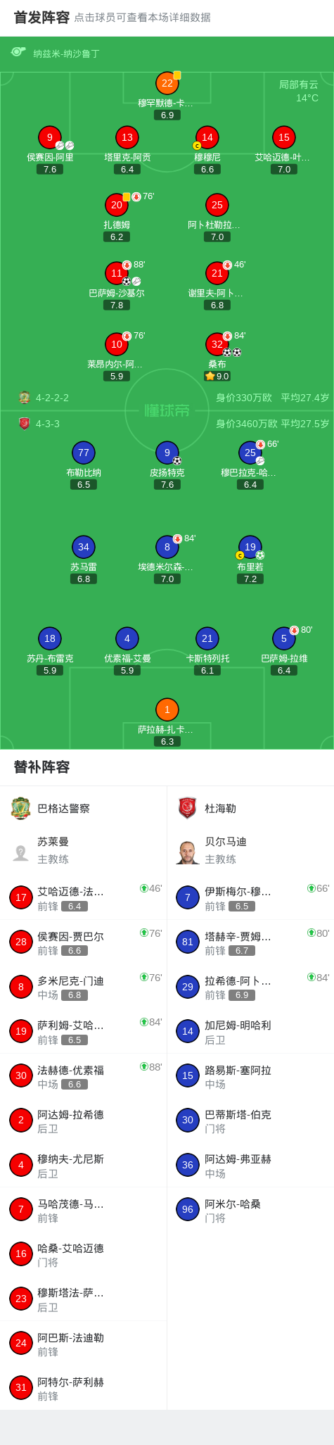 北京时间2月17日亚足联冠军精英联赛 联赛阶段 第8轮,巴格达警察对阵杜海勒。巴格达警察巴萨姆-沙基尔破门,桑布梅开二度。杜海勒皮扬特克破门,布里若破门。最终比分巴格达警察 3-2 杜海勒。