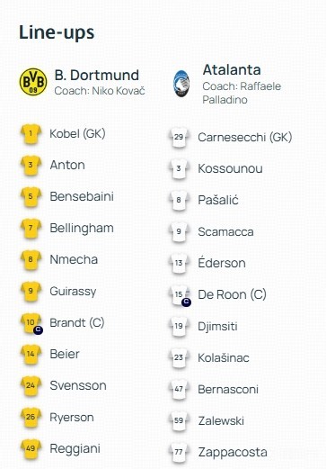 多特首发:1-科贝尔、49-雷贾尼、3-安东、5-本塞拜尼、26-瑞尔森、7-乔布-贝林厄姆、8-恩梅加、24-斯文松、14-拜尔、10-布兰特、9-吉拉西