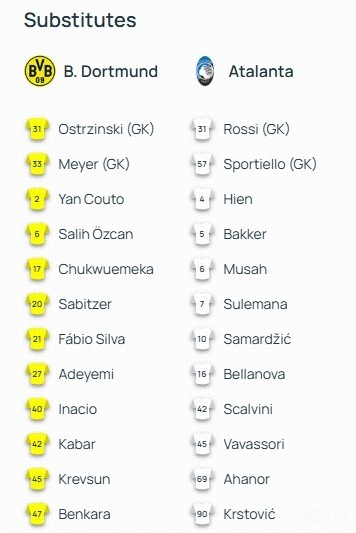 亚特兰大首发:29-卡尔内塞基、3-奥迪隆、19-吉姆西蒂、23-科拉希纳茨、77-扎帕科斯塔、15-德容恩、13-埃德松-席尔瓦、47-贝尔纳斯科尼、8-帕萨利奇、59-扎莱夫斯基、9-斯卡马卡