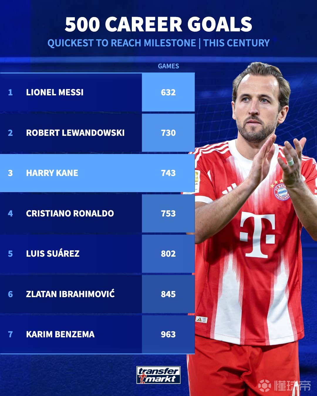 本世纪达到500粒进球所用场次:凯恩第三,梅西、莱万前二