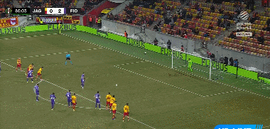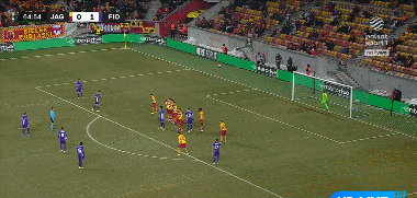 第66分钟,曼德拉戈拉任意球打门,皮球直挂死角,雅盖隆0-2佛罗伦萨