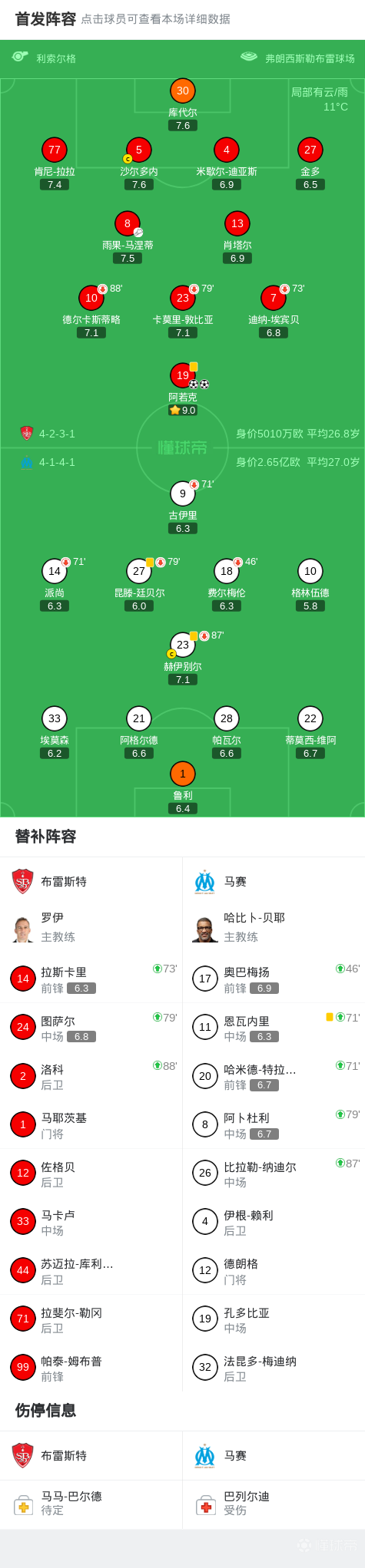 北京时间2月21日法国足球顶级联赛第23轮,布雷斯特主场对阵马赛。上半场,阿若克头槌完成双响。下半场,金多铲人犯规送点,不过格林伍德主罚被扑出。全场比赛结束,马赛0-2不敌布雷斯特。