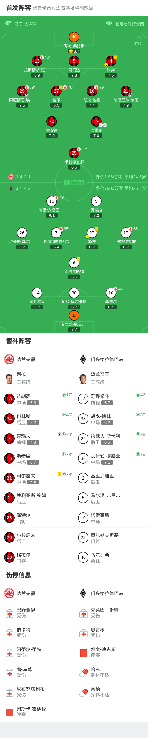 北京时间2月14日德国足球顶级联赛 联赛 第22轮,法兰克福主场对阵门兴格拉德巴赫。法兰克福纳撒尼尔-布朗破门,阿迈穆尼-埃奇古亚布破门,克瑙夫破门。最终比分法兰克福 3-0 门兴格拉德巴赫。