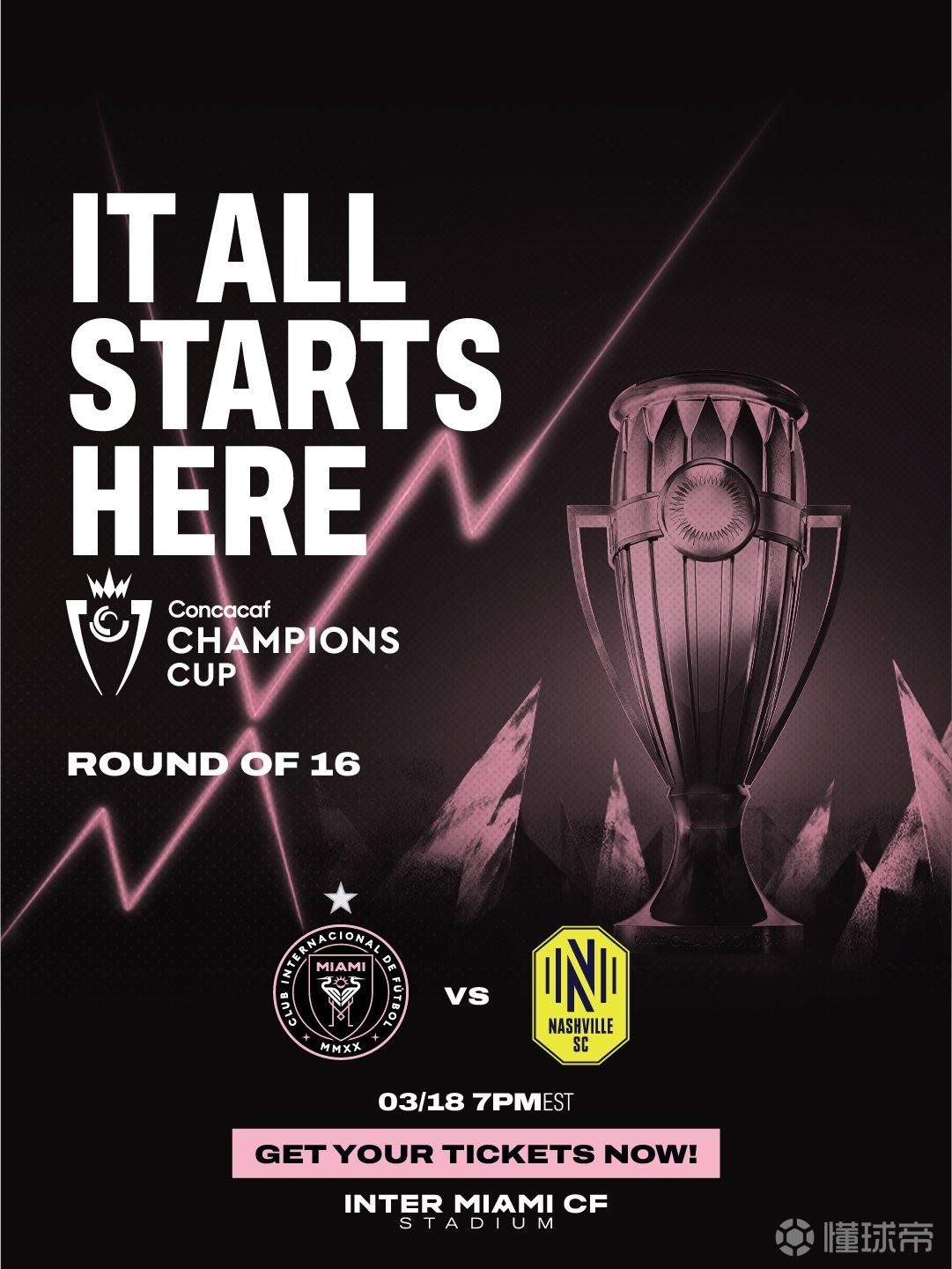 北京时间2月25日,迈阿密国际官方消息,美冠杯1/8决赛次回合迈阿密国际主场对阵纳什维尔将于北京时间3月19日8:00开球。比赛在迈阿密国际主场举行,目前球票已经可以预定。